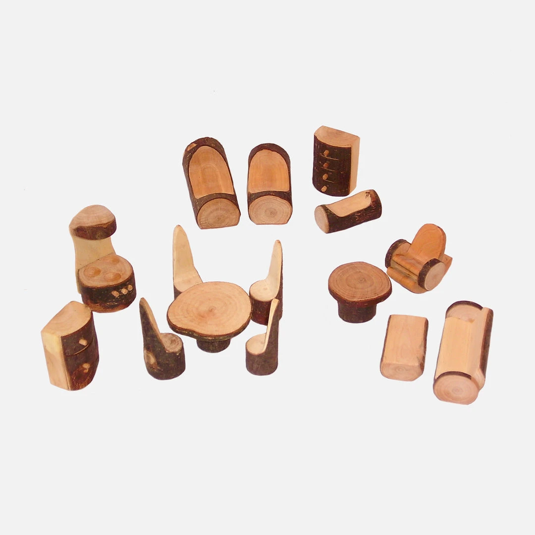This wooden living room set contains a sofa, a rocking chair, a foot rear and a table. Perfect for use in our wooden treehouses.