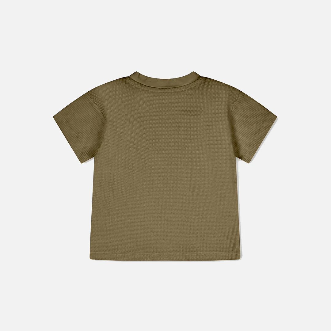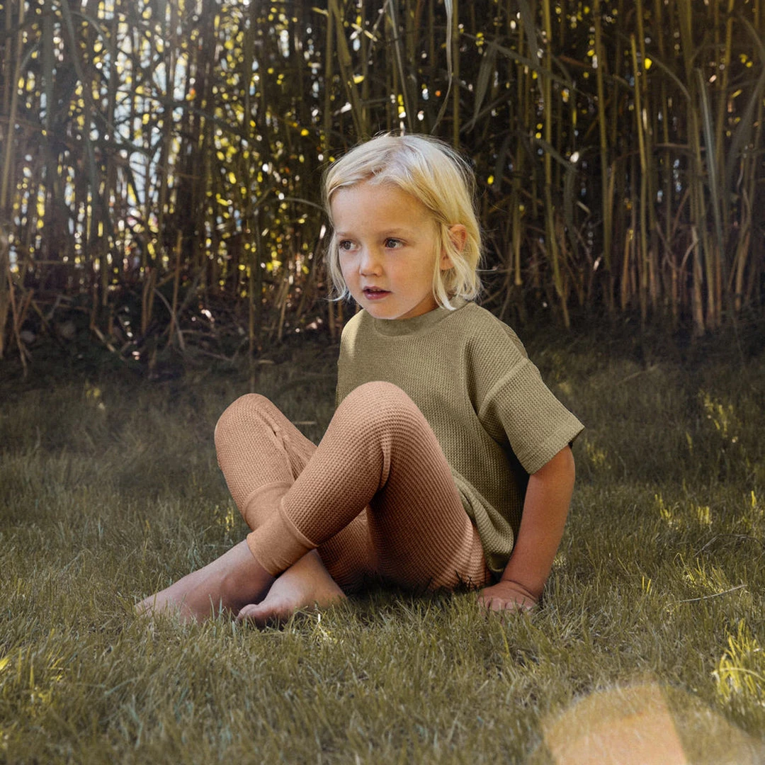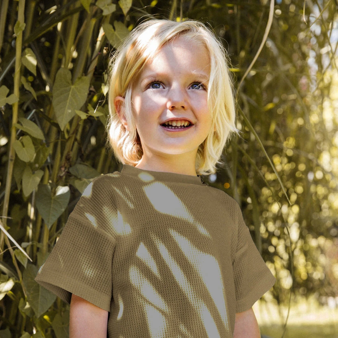 Soft and lightweight T-shirt from Matona’s new basic collection. Knitted in a soft waffle pattern, it is the perfect addition to your timeless wardrobe. It features a boxy cut, and it is great for boys and girls. It can be worn on its own or styled as a layer. The yarn is dyed with plant-based colours.