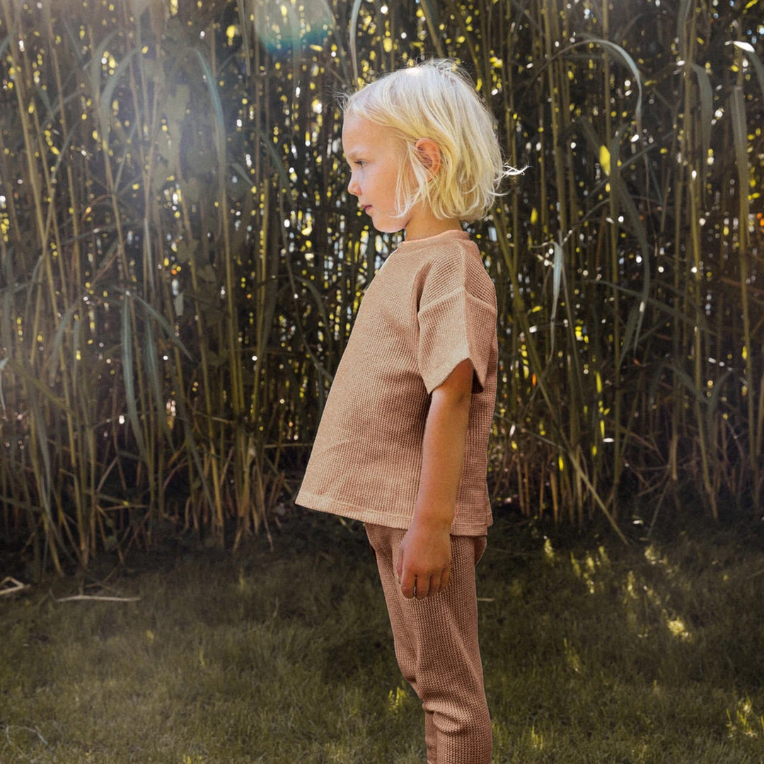 Soft and lightweight T-shirt from Matona’s new basic collection. Knitted in a soft waffle pattern, it is the perfect addition to your timeless wardrobe. It features a boxy cut, and it is great for boys and girls. It can be worn on its own or styled as a layer. The yarn is dyed with plant-based colours.