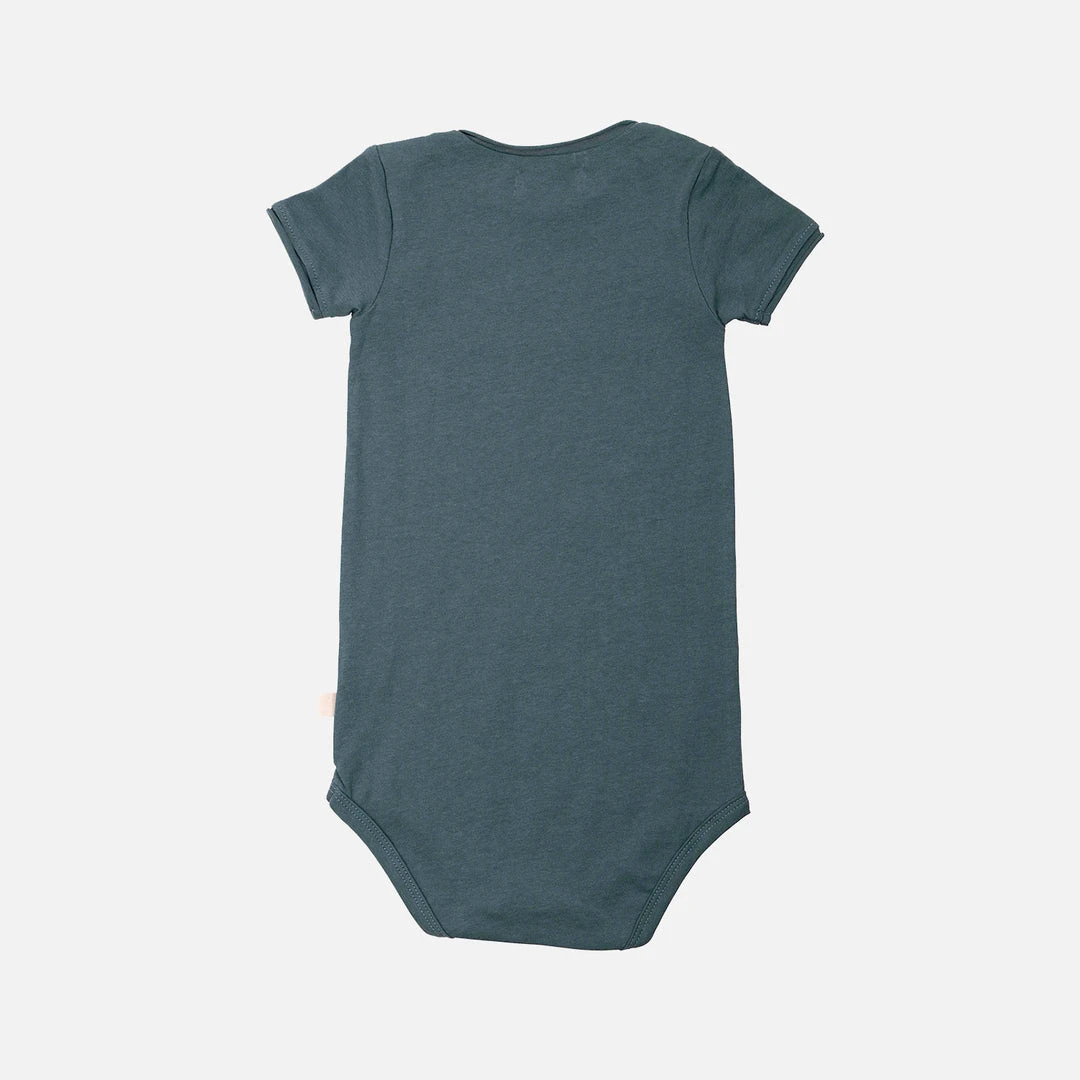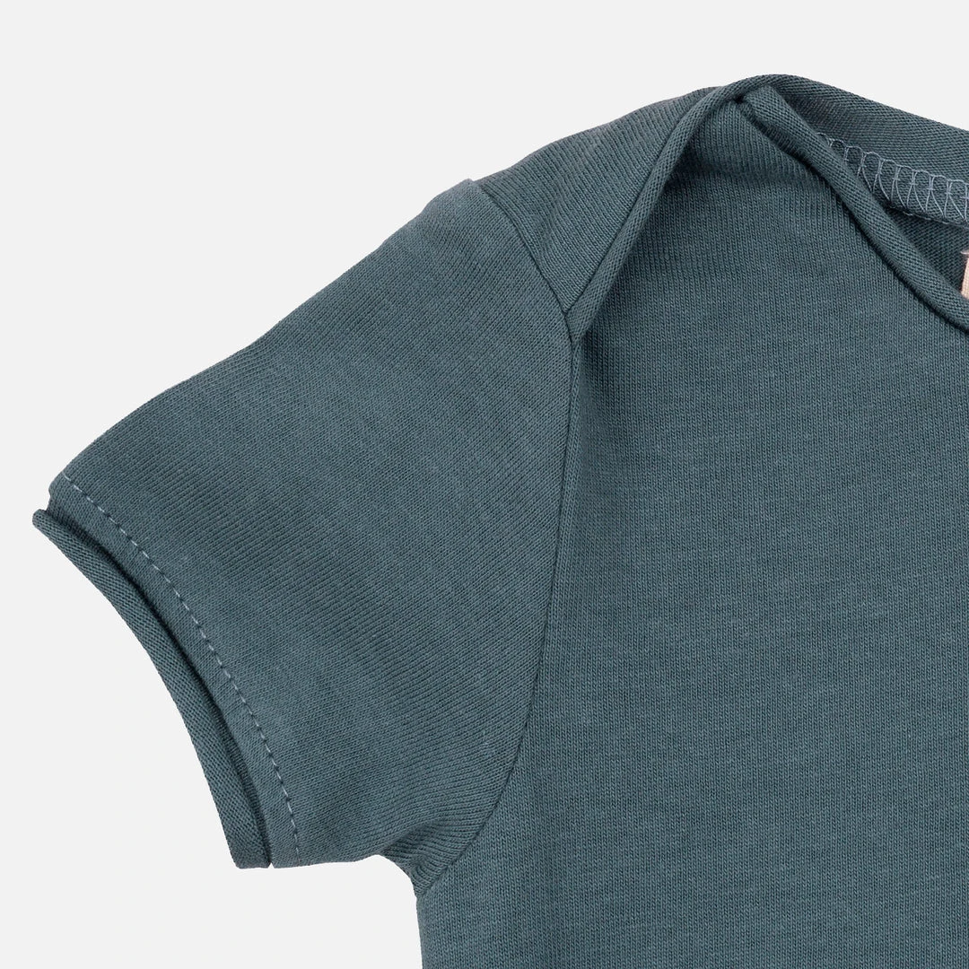 Soft short-sleeve body with envelope neck-opening. The sleeve and neck opening have rolling raw edges. The body features two YKK popper fasteners, nickel free.