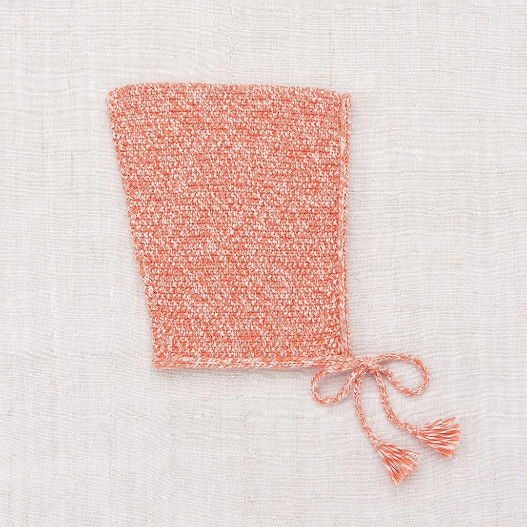 The sweetest little pointy bonnet, made in a seed stitch marl yarn with a fun tassel detail. It has a simple i-cord fastening. Brought back from the Misha & Puff archives, this bonnet will look great with the matching romper, either you choose to mix or match colours.