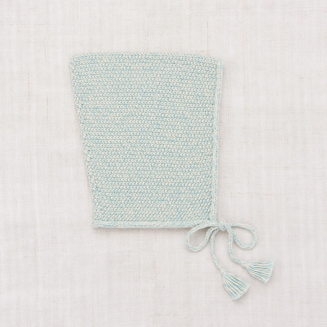 The sweetest little pointy bonnet, made in a seed stitch marl yarn with a fun tassel detail. It has a simple i-cord fastening. Brought back from the Misha & Puff archives, this bonnet will look great with the matching romper, either you choose to mix or match colours.