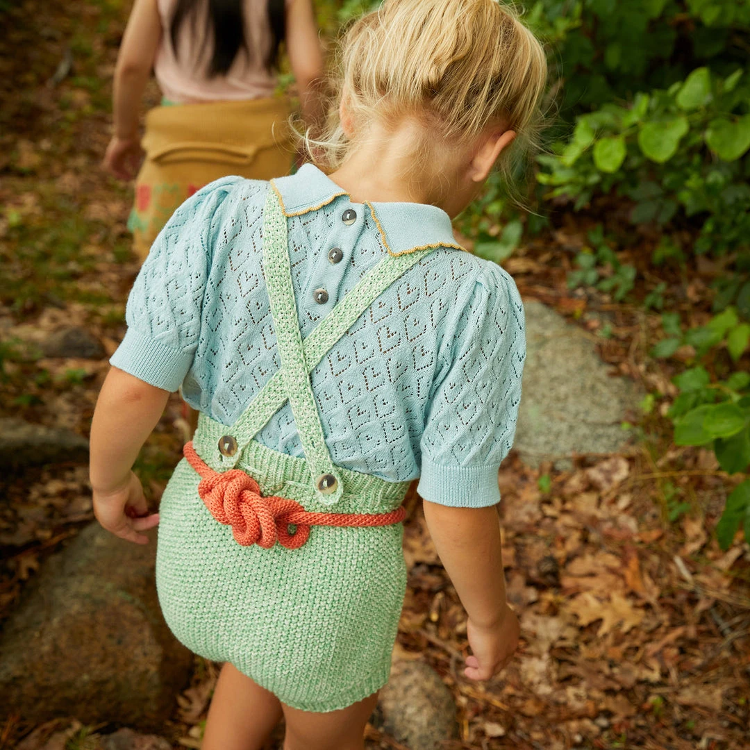 The Starfish Sunsuit is a long time favourite style, brought back from the Misha & Puff archives. Featuring a square neck with a drawstring waist, this style is made in a textured seed stitch marl yarn. Knitted shoulder straps button at the back and can be worn crossed or uncrossed, depending on the fit required.