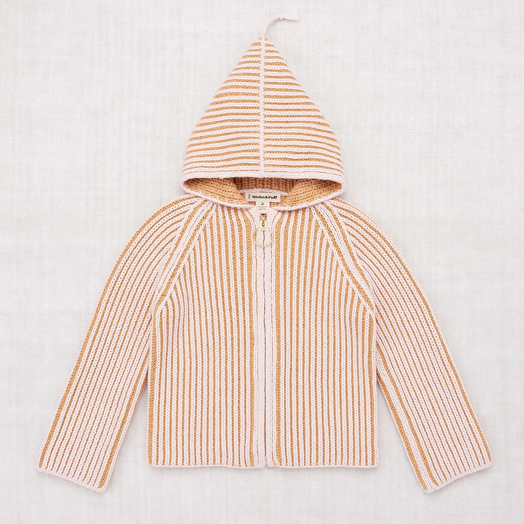 Raglan style in a two tone fisherman rib knit. Peaked hood with a tassel and down toggle closure. Can be styled as a cardigan or a light jacket for the warmer days.