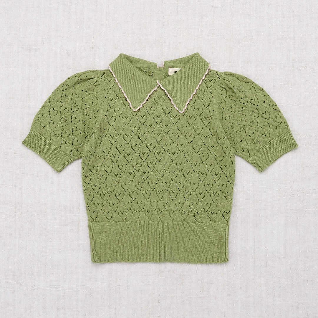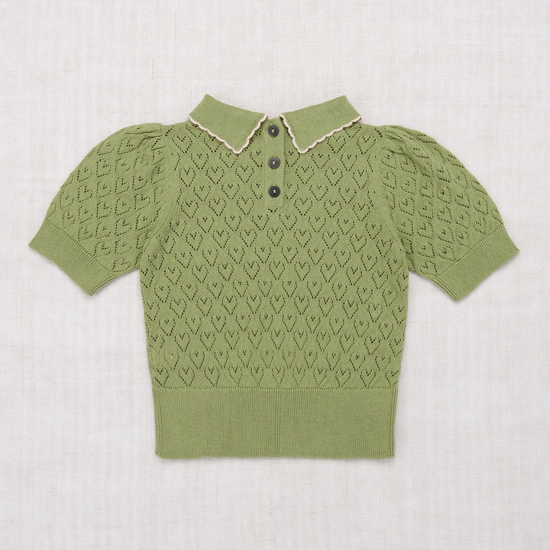 The Joanna blouse is a new style for us this season. It features short puff sleeves and a sweet collar with a contrasting edge detail. The knit has a pattern which adds a bit of texture. Designed with natural horn buttons at the back neck.
