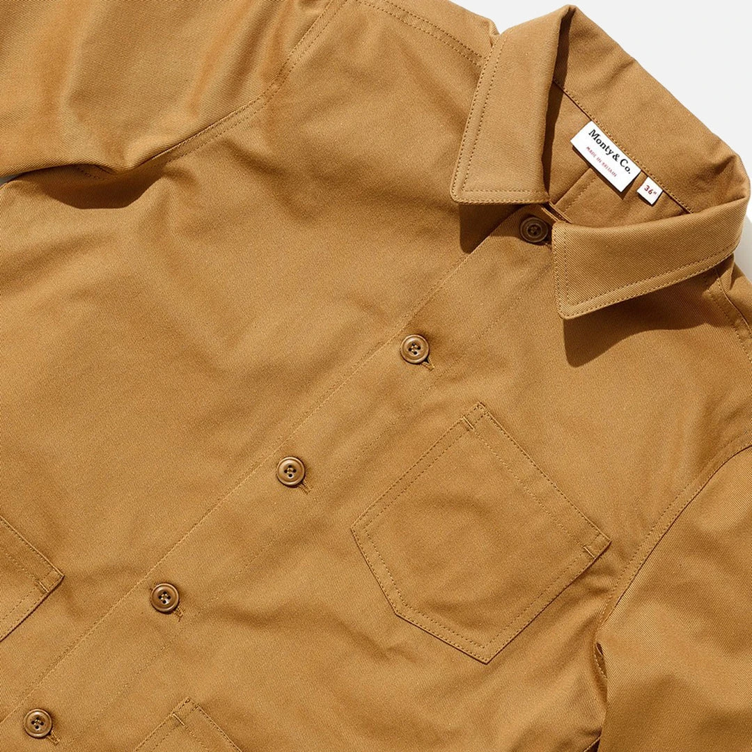 DESIGN: Single breasted with a one piece collar. Two front square deep patch pockets as well as one spade chest pocket. Navy bar tacks on pockets for reinforcement with 5 front Corozo buttons in toffee, for fastening. Navy herringbone tape inside cuff for tidy rolled up sleeves. Branded “Monty” woven flag label at pocket. Twin needle stitching for durability.
