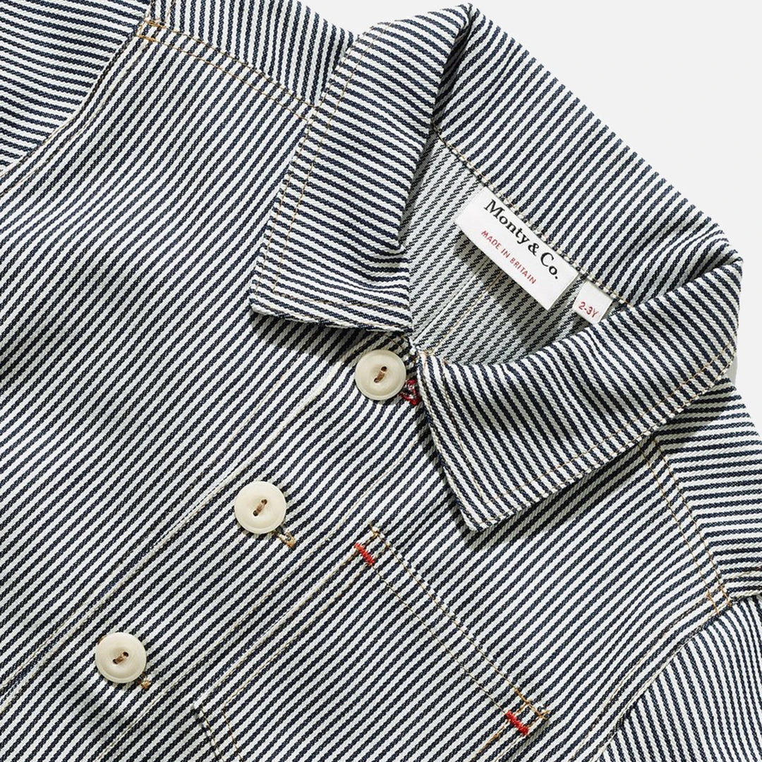DESIGN: Single breasted One piece collar Two front square deep patch pockets One spade chest pocket Navy bar tacks on pockets for reinforcement  5 x button front fastening 1940’s Utility inspired buttons in toffee, large enough for small fingers Hanging loop in navy herringbone on back collar Navy herringbone tape inside cuff for tidy rolled up sleeves Branded “Monty” woven flag label at pocket Twin needle stitching for durability