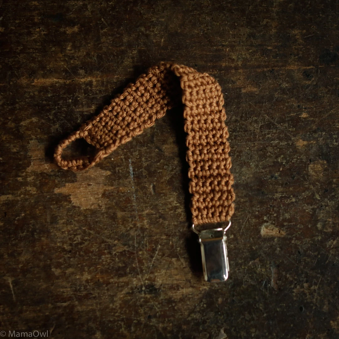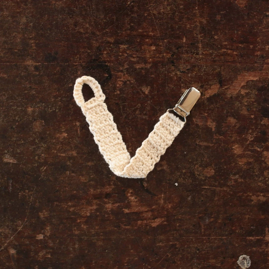 Hand crocheted soother holder in 50% cotton and 50% merino wool. Can be washed on a wool program or by hand. Please make sure to dry the clip very well so it does not rust.Â