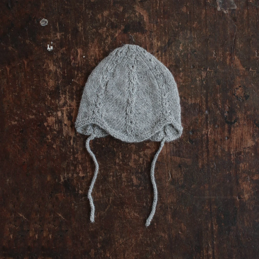 A beautiful and soft hand-knit bonnet with twists along the decrease. These types of bonnets are a classic in Denmark a classic that every danish baby wears. It’s the perfect shape to keep little heads and ears warm and It sits snugly with its characteristic tip on the forehead which protects the fontanelle.