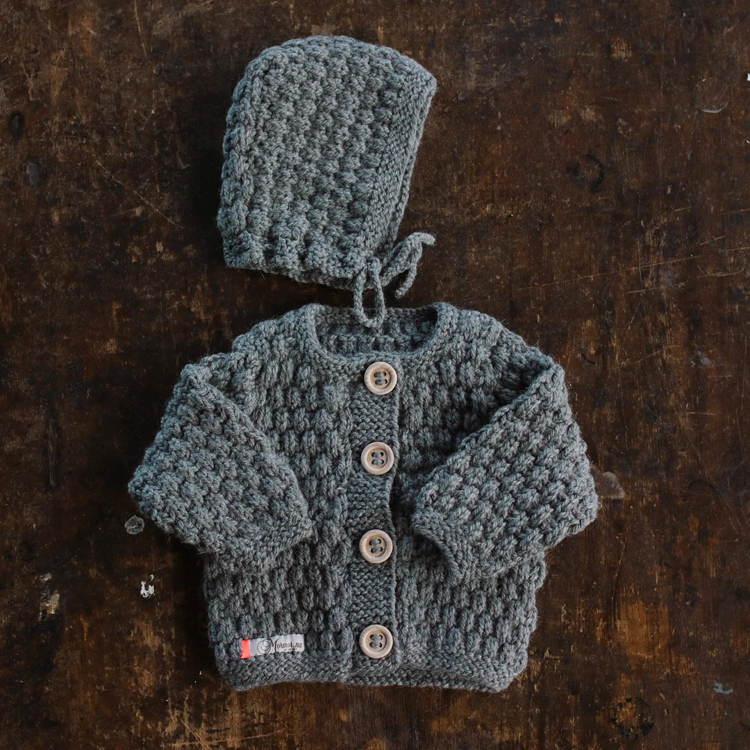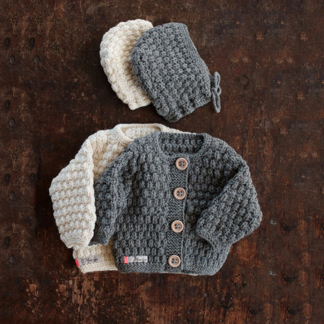 This is a really chunky baby jacket in soft merino, very warm and very soft it comes with a matching bonnet.Â