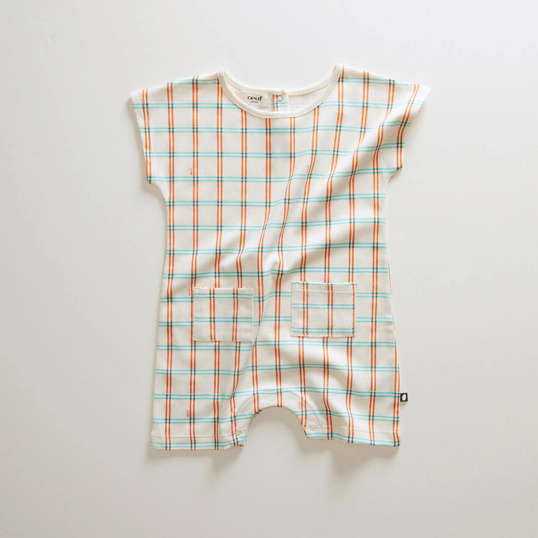 A lightweight and soft cotton romper, perfect for summer. A great unisex style which is easy to layer over tights and under cardigans during cooler weather. Features this season’s check print. Designed with short sleeves and two front patch pockets.