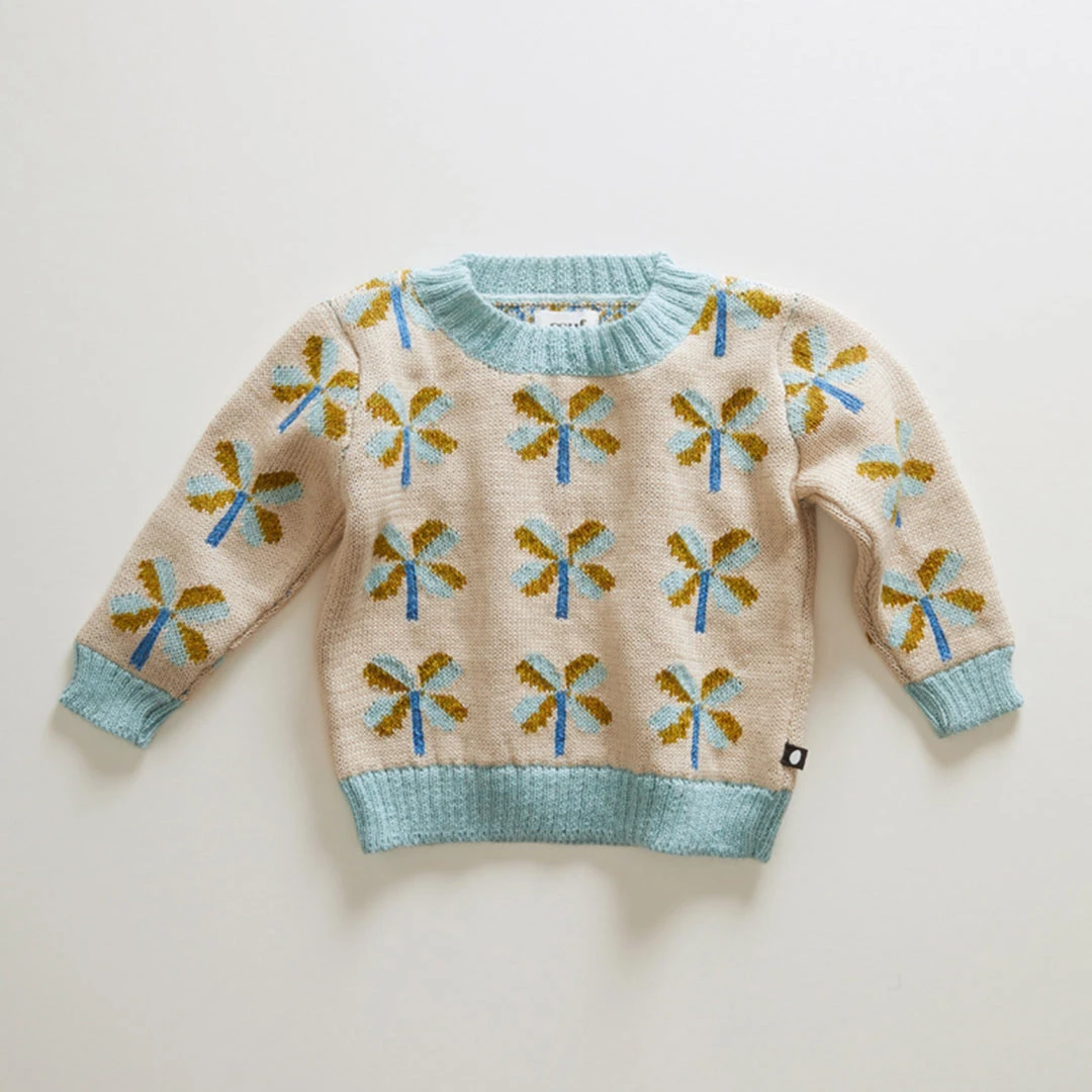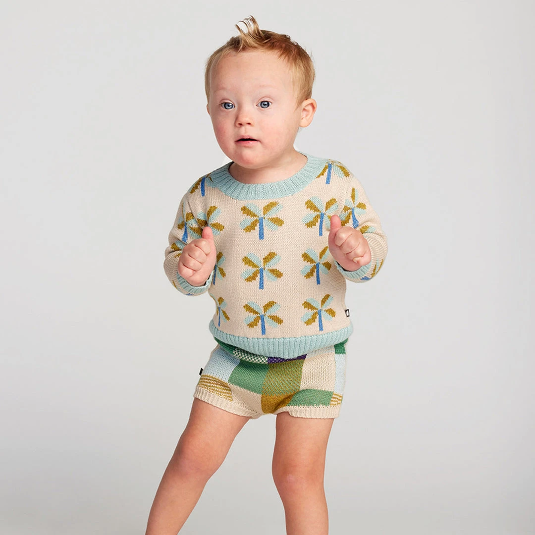 This knitted sweater features a clover pattern with contrasting neckline, cuffs and hems. Super soft, perfect for summer and in between seasons.