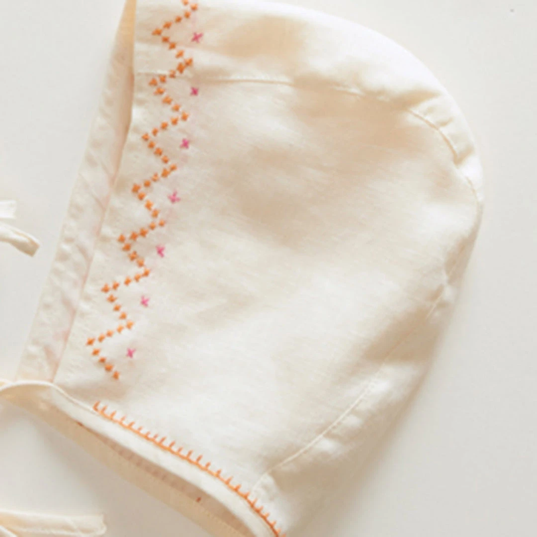 A sweet little cross stitch detail bonnet. Looks great worn with the matching romper for a full summer outfit. Lightweight and offers a little extra sun protection for your child’s head when outside. Has a simple tie fastening to stop the bonnet falling off.