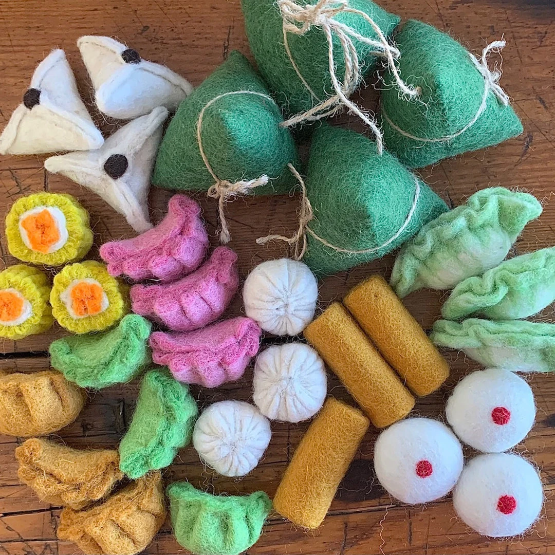 Yum Cha set for the little food and culinary curious child. Add diverse food to imaginative play. This set includes 4 Zhongzi, 3 Chunjuan, 3 Shaomai, 3 Baozi, 3 Tangsanjiao, 3 Mantou,3 Green/White Jiaozi, 3 Pink Jiaozi, 3 Pumpkin Jiaozi, 3 Green Jiaozi.