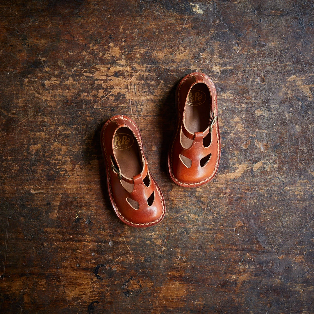 The much loved classic Pepe style T-bar with classic visible upper stitching detail. Features a buckle fastening for a secure fit. Designed with a round toe and space for growing feet, branded insole and a flat leather sole with rubber heel. This is a classic shoe with a leather sole and it is not very flexible.