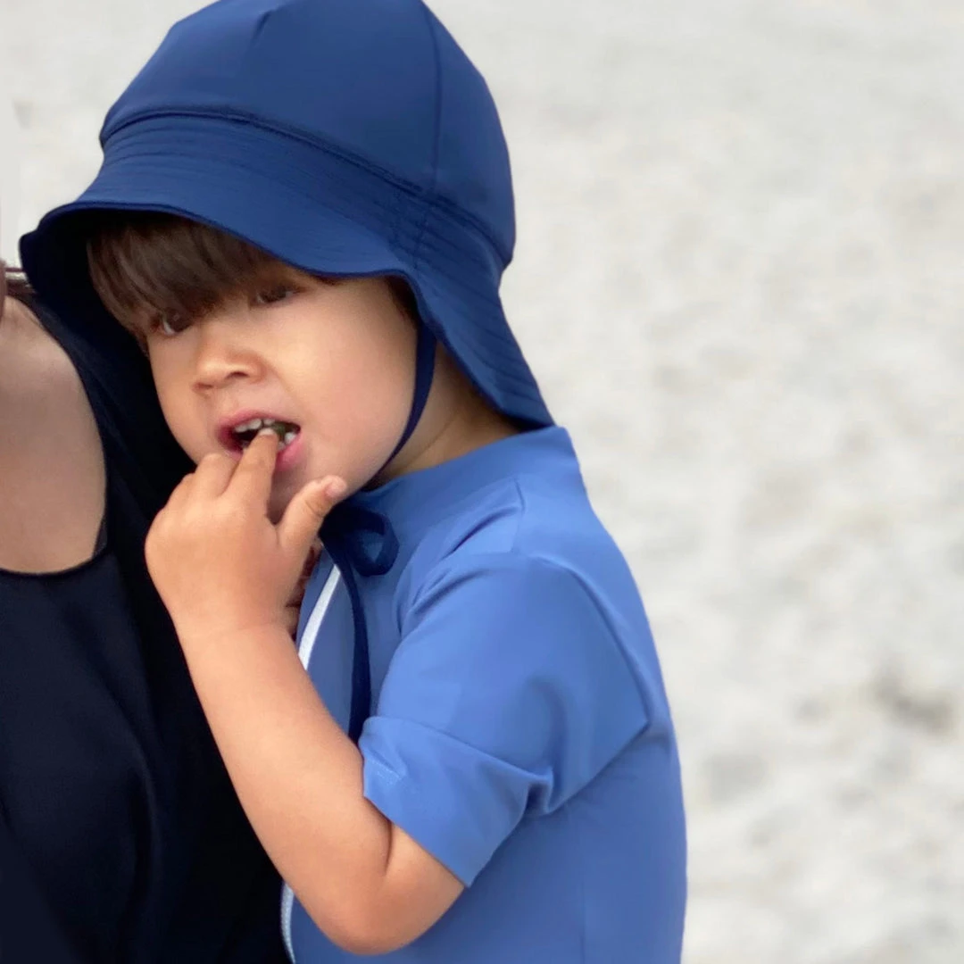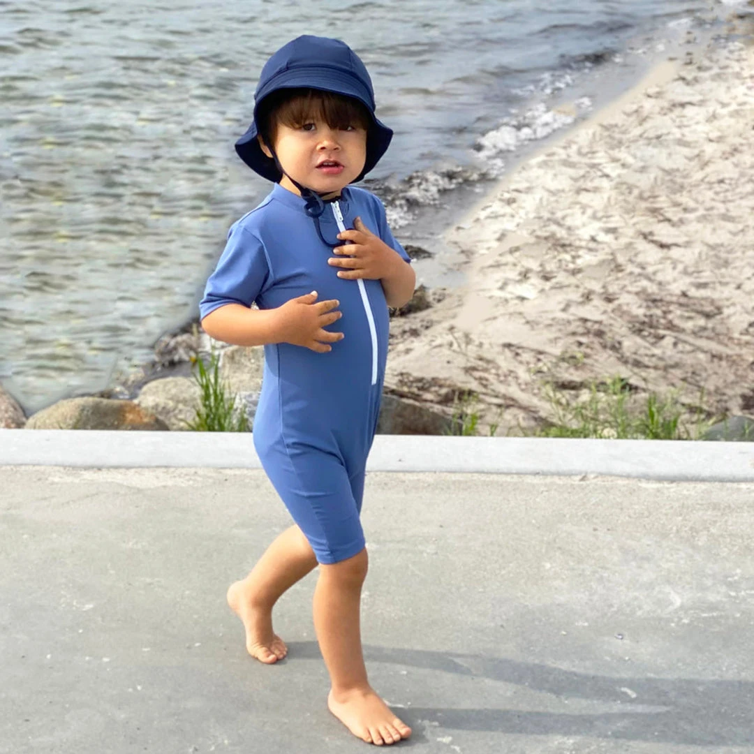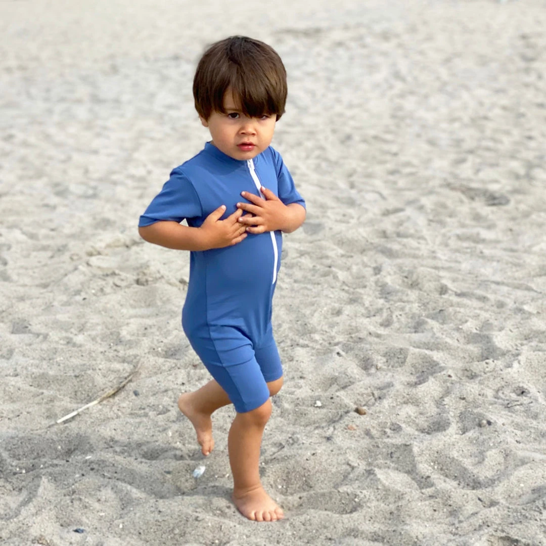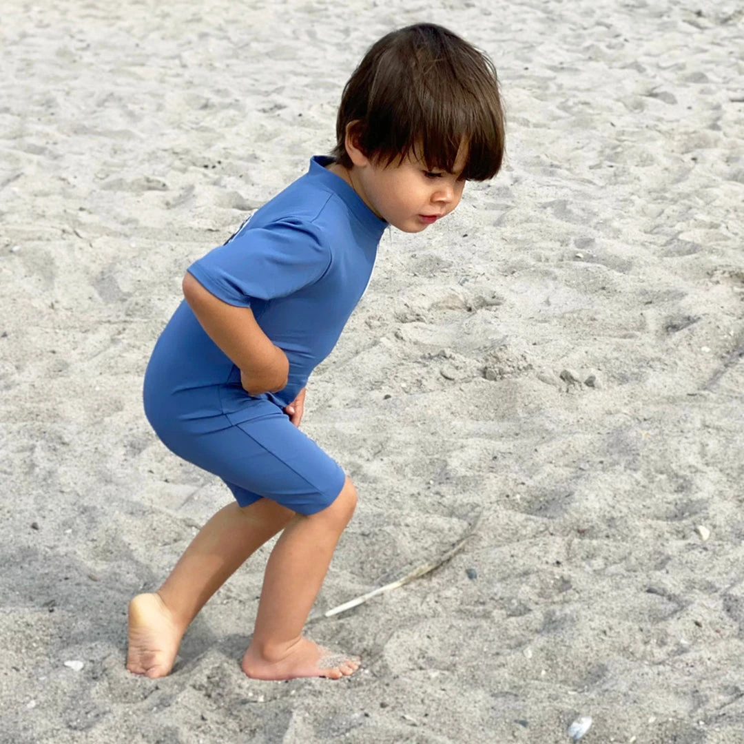 A great UV body suit for a day playing on the beach. Designed with short sleeves and legs for those who want protection from the sun’s rays. This sunsuit is without an appliqué on the back, it is solid colour all over. Combine this suit with a hat for maximum sun protection. Easy open front with a YKK zip and zip protection flap.