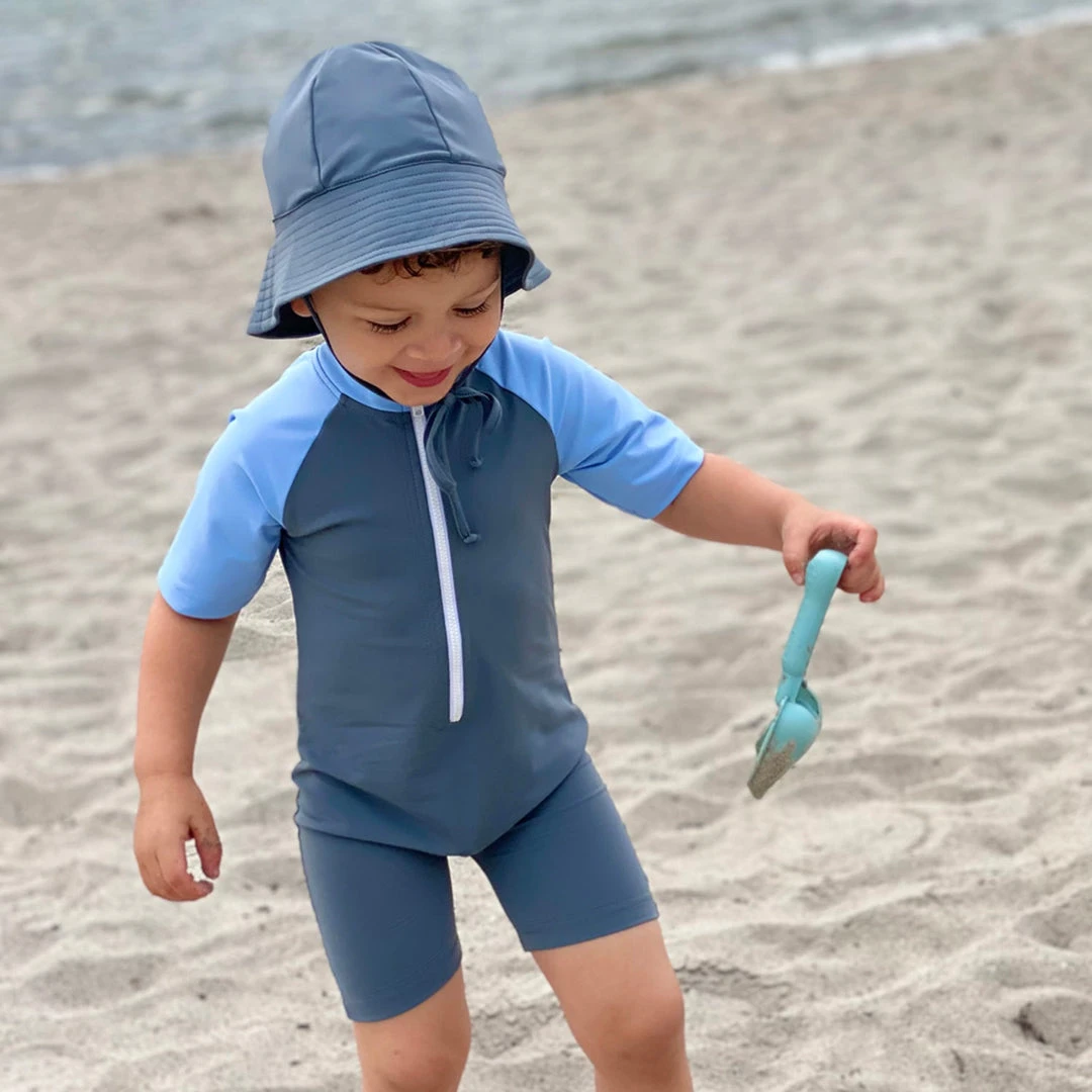 A great beach and swim hat with good protection and extra long shadow in the neck. Size 0-2 years has drawstrings, size 2-8y is without ties. The hat is suitable to wear in the water. It provides shade, it can cool the child’s head and dries quickly.