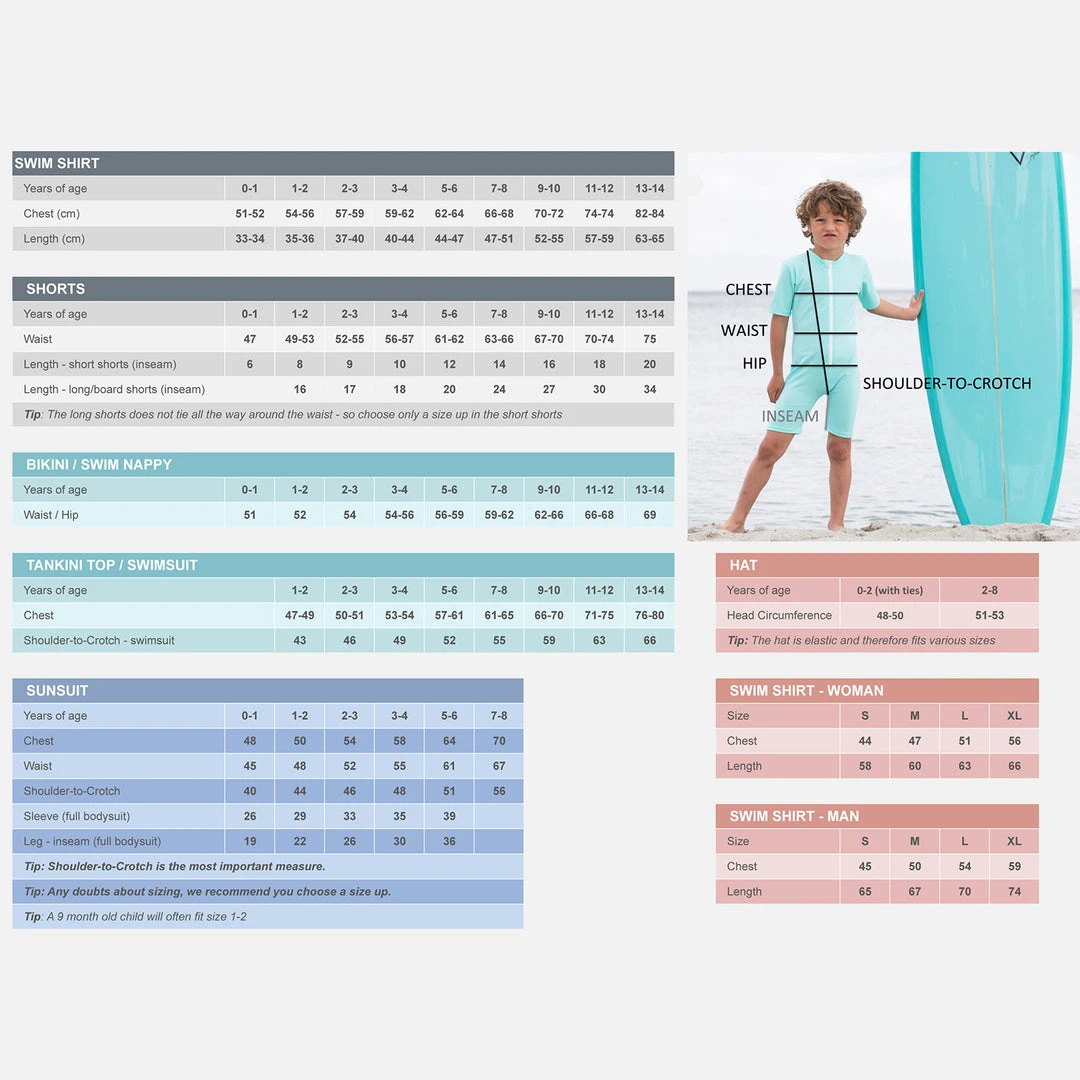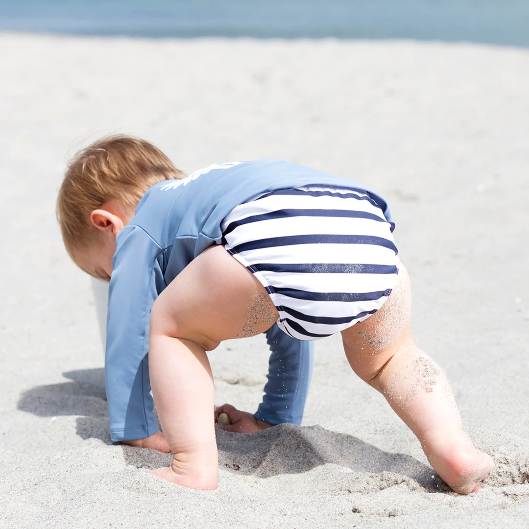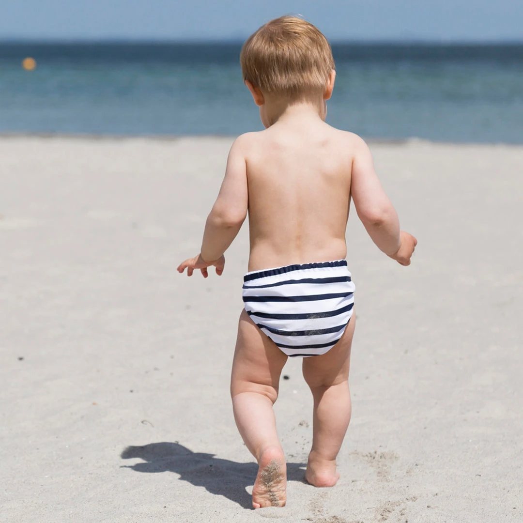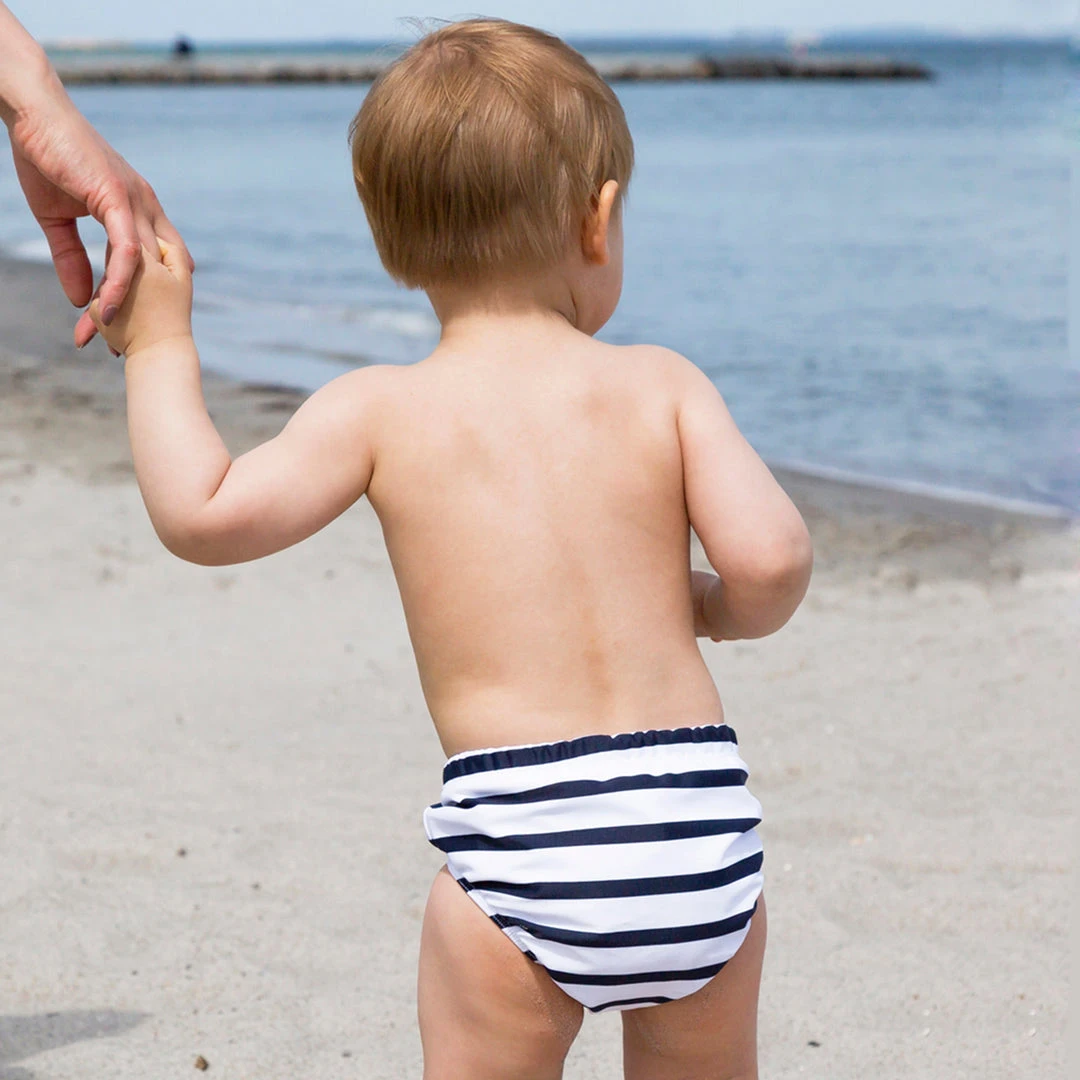 The outer fabric of the swim nappy is 80% Polyamide and 20% Elastane / Lycra with UPF 50+. The pants are lined with a soft 2-sided anti-leak fabric containing, respectively a layer of 100% polyester and a layer of 100% polyurethane. All fabric in the swim nappies is Oeko-Tex certified.
