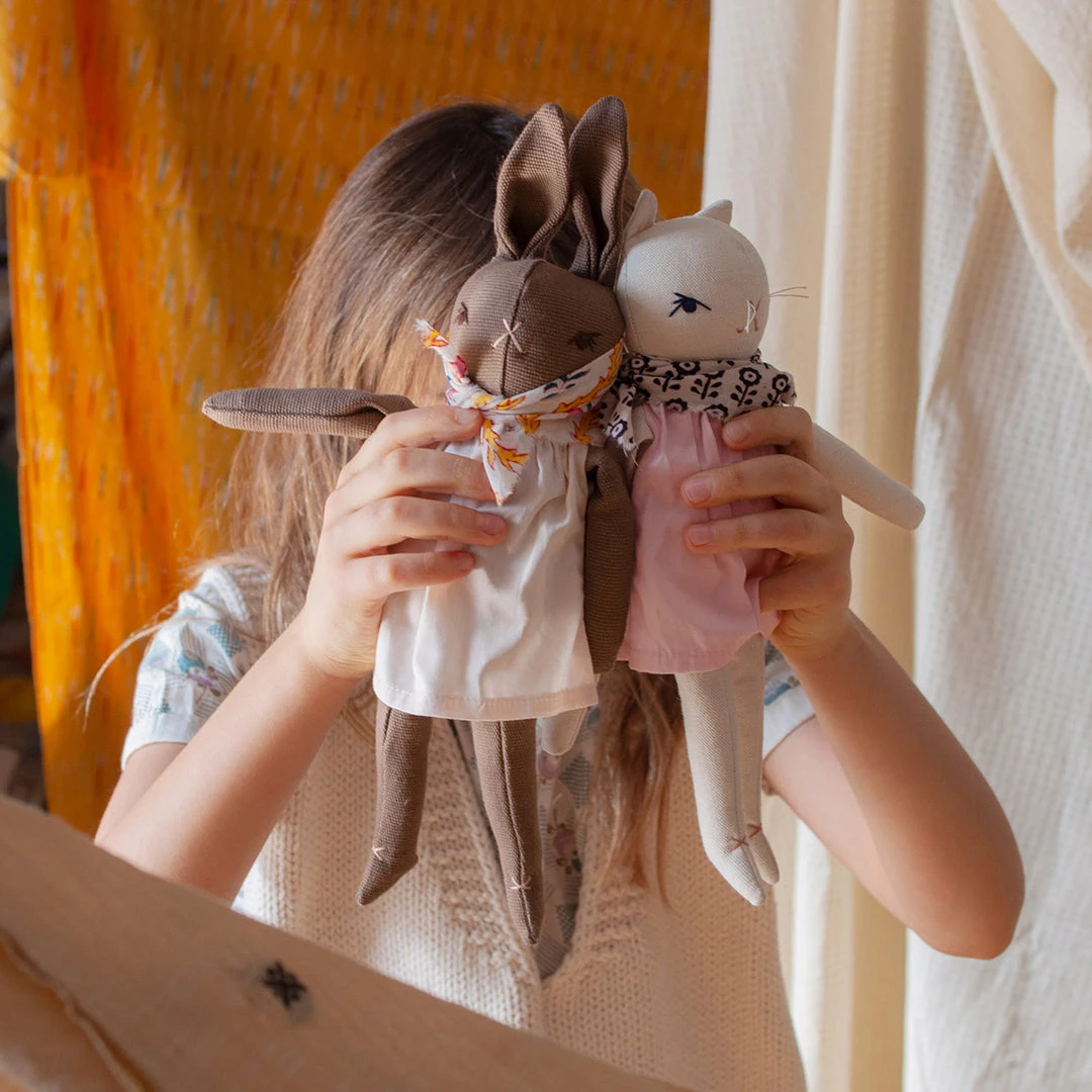The small rabbits are beautifully handmade in cotton canvas. The cream and brown rabbits are wearing a cotton dress and a headscarf. The peach rabbit is wearing bloomers and a handwoven neckerchief. Hand embroidered face.