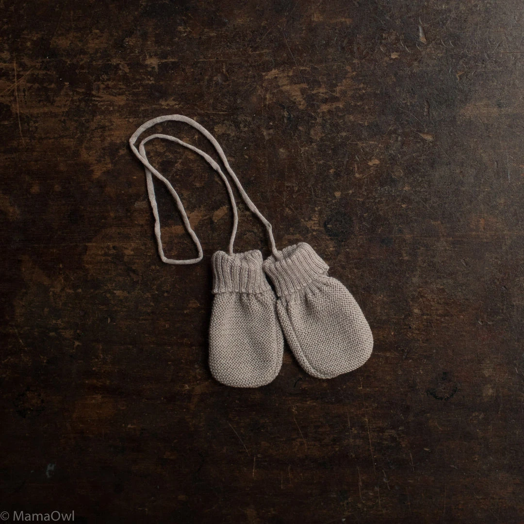 Cosy and soft merino wool baby mittens. The special knit that grows with your baby. The fold back cuffs make them stay on and the cord ensures that they will not get lost.