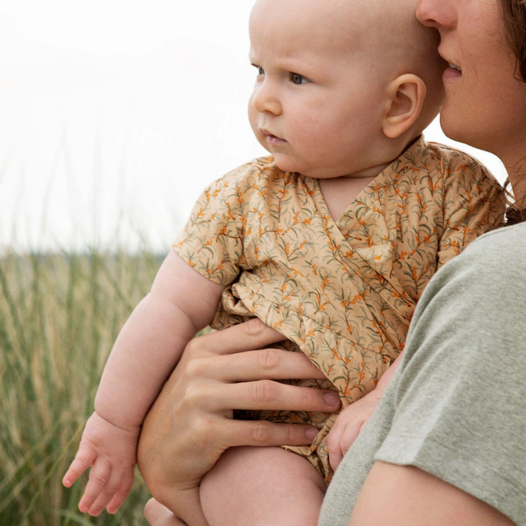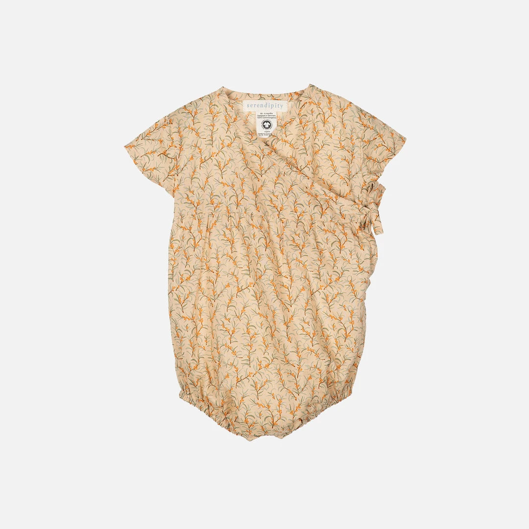 Soft lightweight woven cotton baby wrap romper in a beautiful summer print. Features a tie closure for easy dressing. Perfect for warm summer days styled with a sun hat for outdoor adventures.