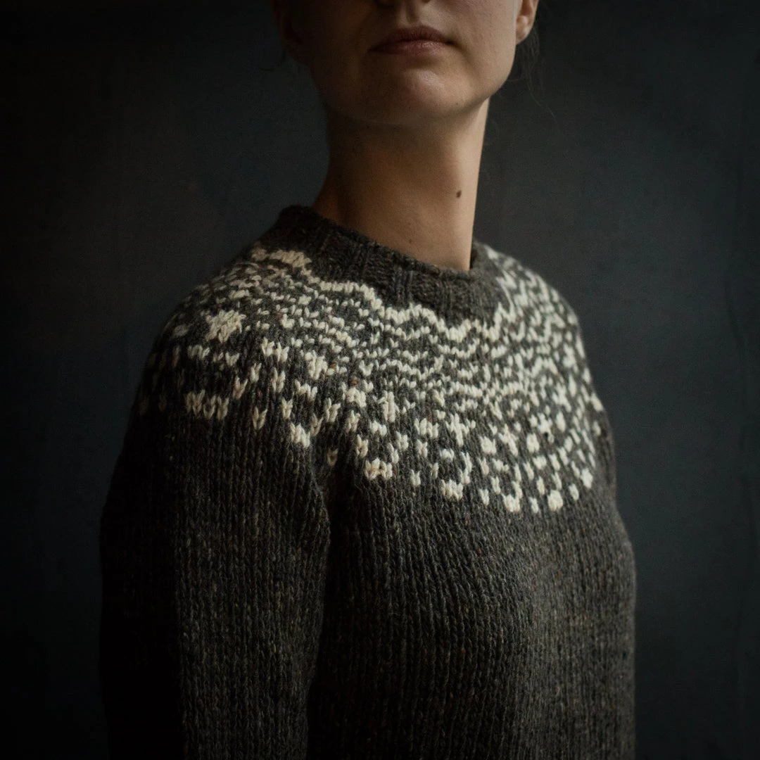 Chunky knit sweater in 100% Donegal Merino Wool, knitted with a contrasting yoke pattern. Chunky but really light and soft, all the warmth without the weight. The fit is relaxed and boxy with raglan sleeves, perfect layer all year round.Â