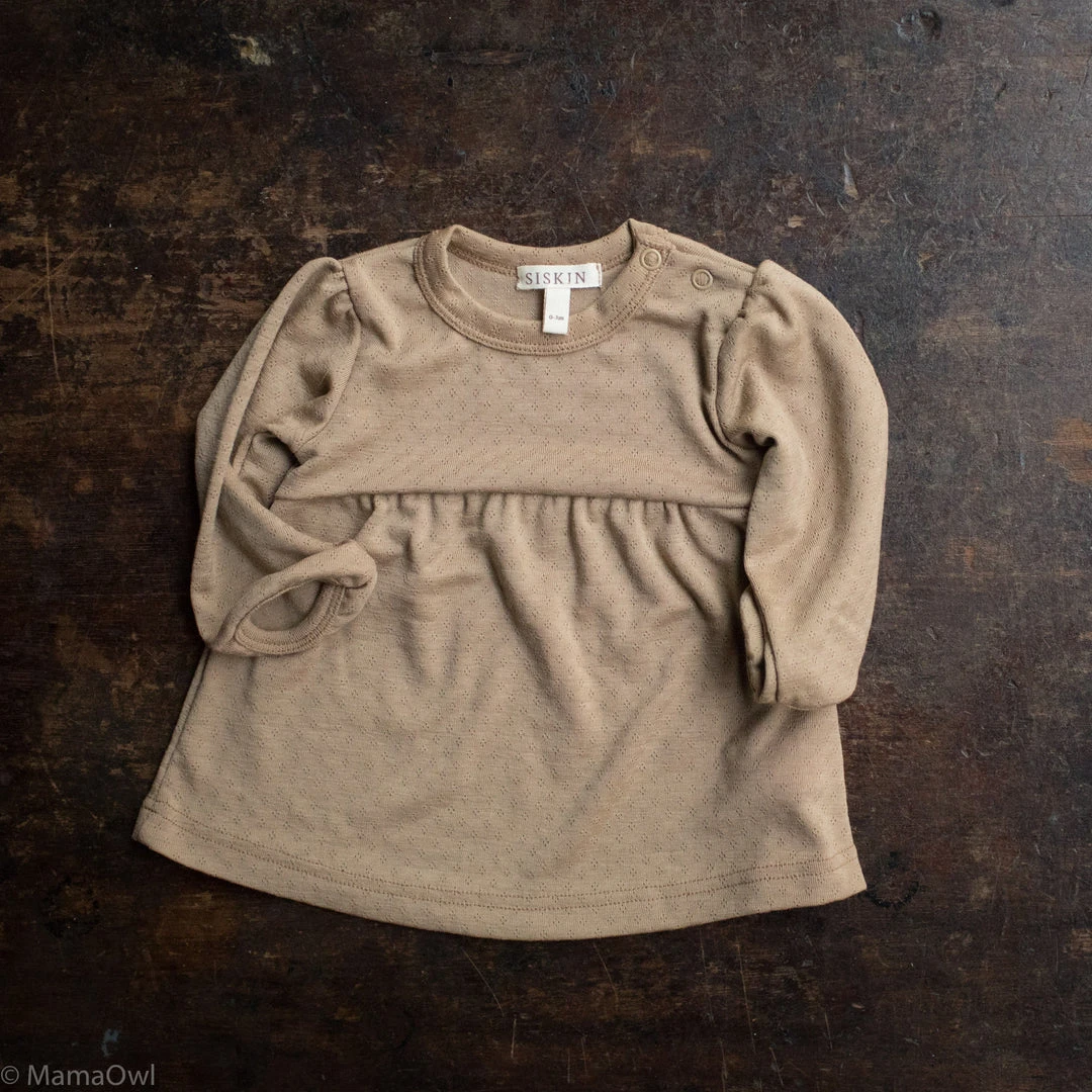 A really sweet dress, super soft and perfect weight for winter, made from the softest wool and silk for extra comfort. Deigned with a subtle pointelle pattern to add texture. The perfect dress all year round. Designed with two snap buttons on the left shoulder, a round neckline, long sleeves and sweet gathered cuffs.