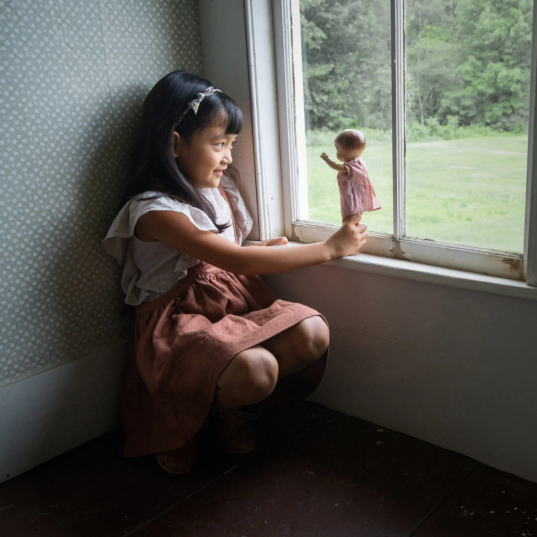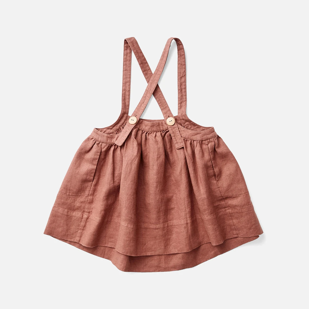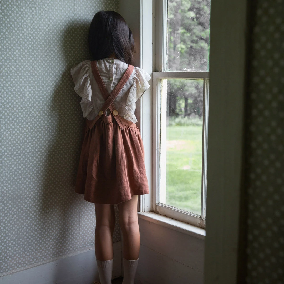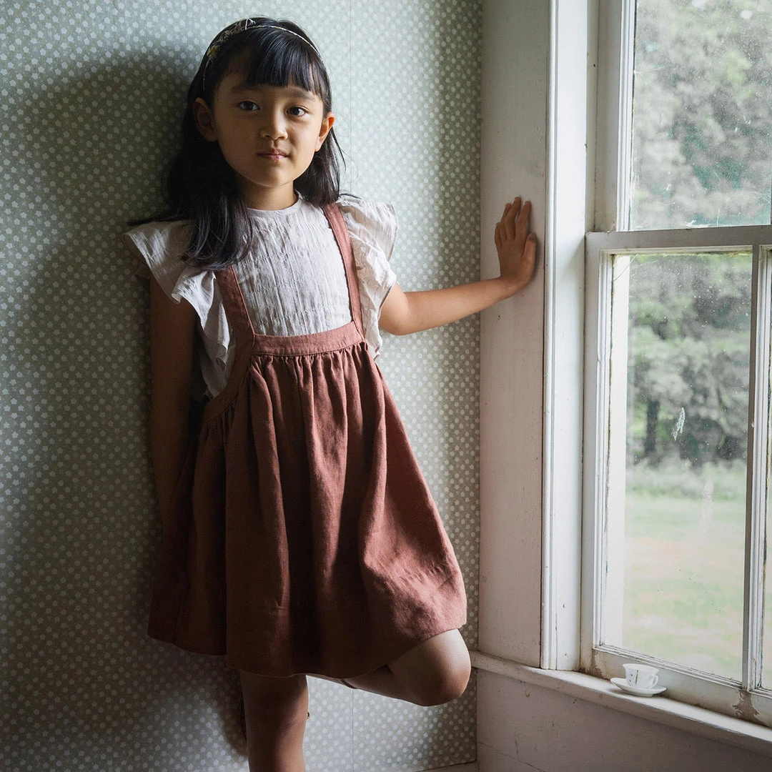 Soor Ploom’s signature Eloise pinafore is designed with a loose and relaxed fit. It features adjustable criss-cross straps at the back with a wood button closure. Designed with pockets at the sides. This style falls just above the knee.