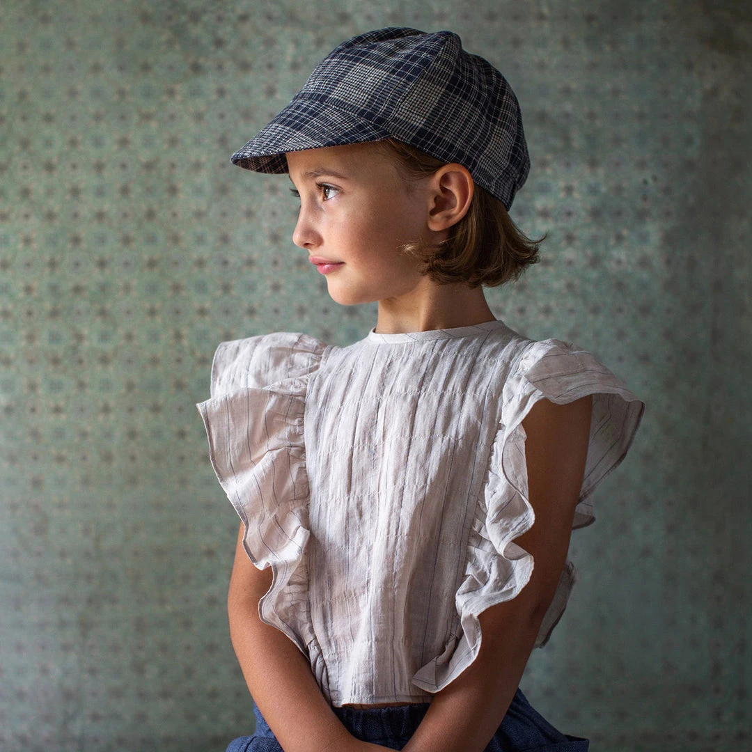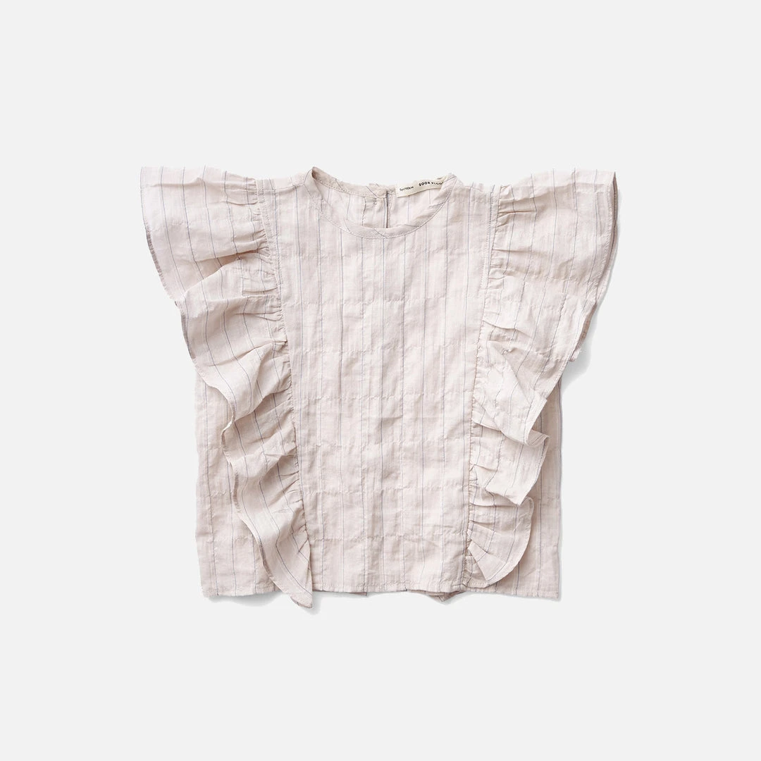 This cropped blouse has an exaggerated, tapered ruffle at the princess seam. Features a delicate shell button fastening at the centre back. Running from the neckline to the hem. Works beautifully underneath pinafores or dungarees.