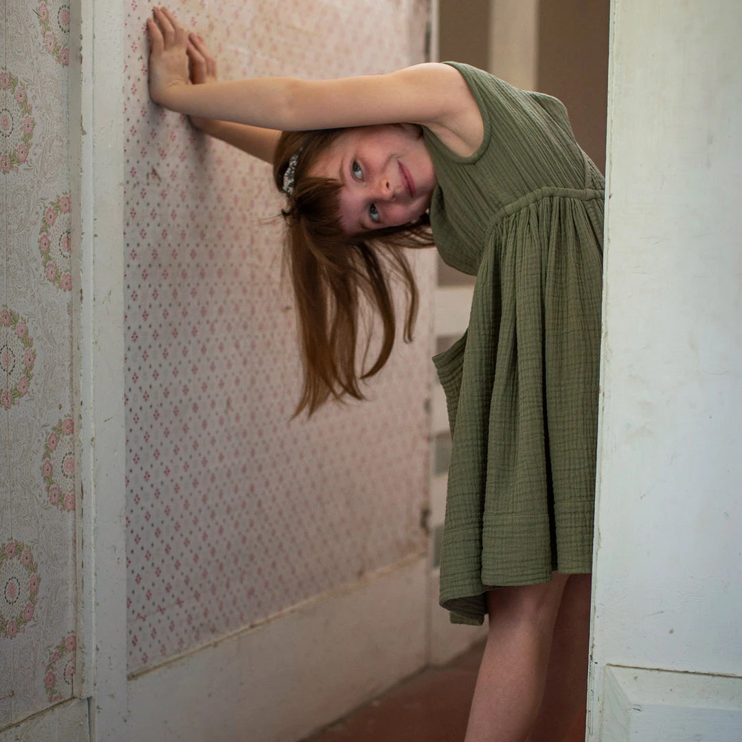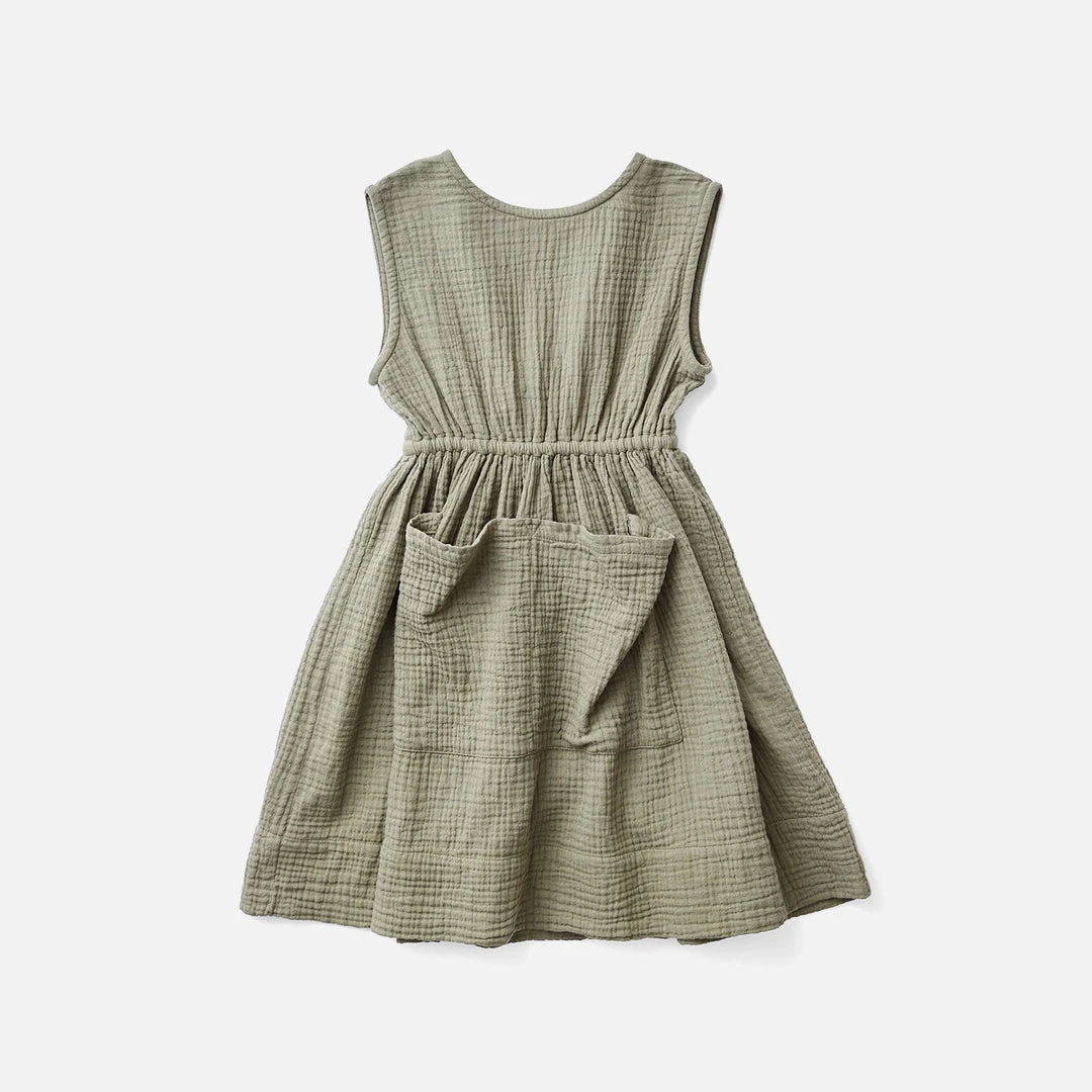 The Orla dress is a summer favourite. It features a large apron pocket at the centre front of the skirt and an elasticated waist for a comfortable fit. Designed with a wrap back bodice. This is a longer length dress which falls to the knee.