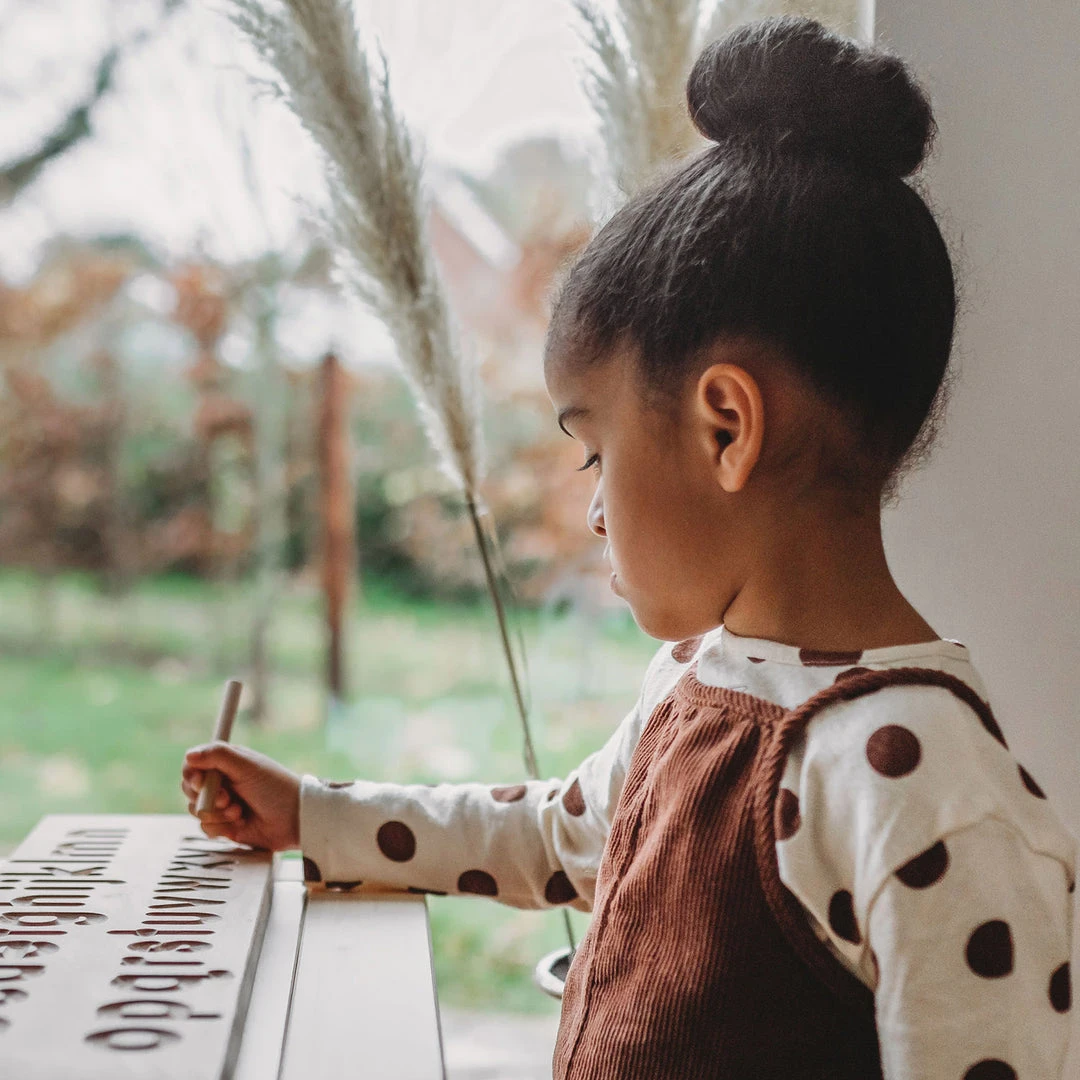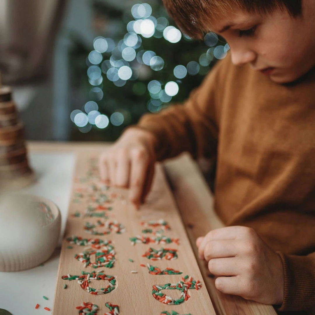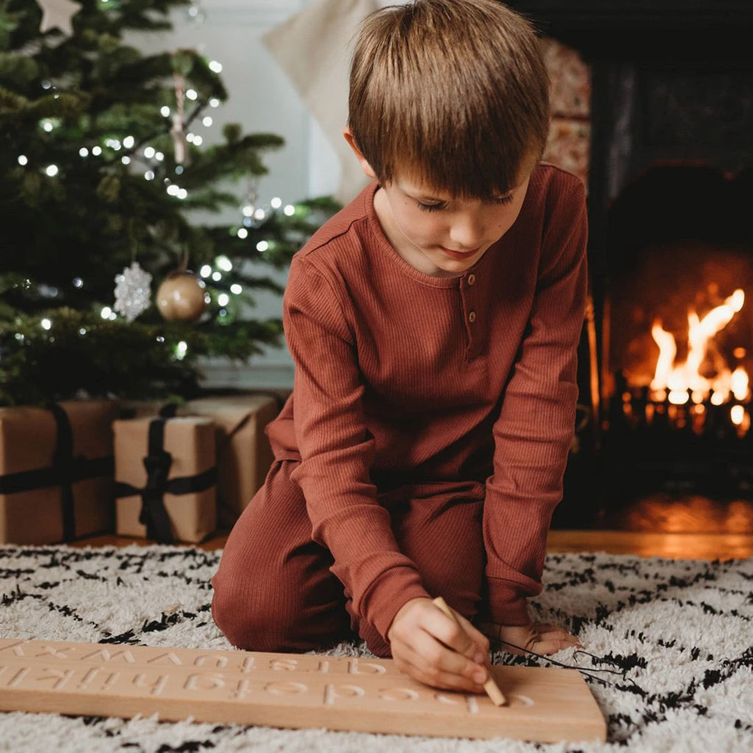All boards are made from solid beech wood sourced from local wood suppliers in Italy and Germany. They are finished with a natural raw oil. The board comes with a tracing stick which is designed to help develop pencil grip.