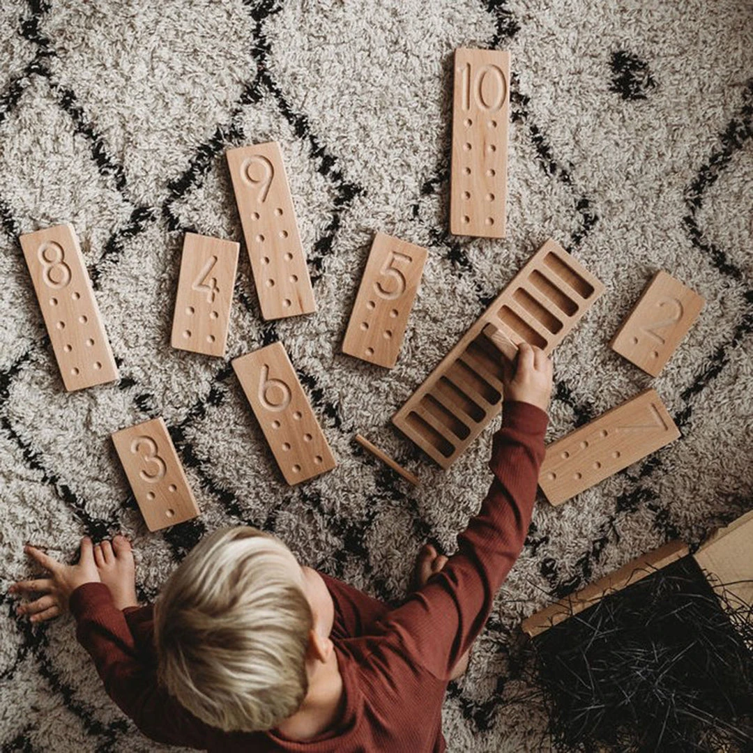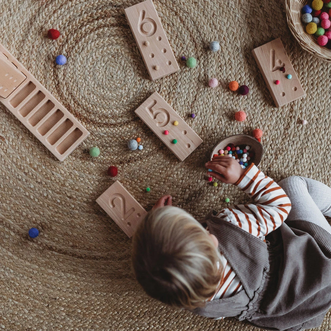 Individual counting blocks with numbers 1-10. Each block has a written number with counting holes matching the number on the block. The counting holes make it easy to identify if it is an odd or even number. Each block has been designed to increase in size as the number is growing and come with a custom stand so that each block can be stored securely. Great used with Grapat mandalas or little felt balls that can be made out of felting wool from Filges for counting with the blocks.