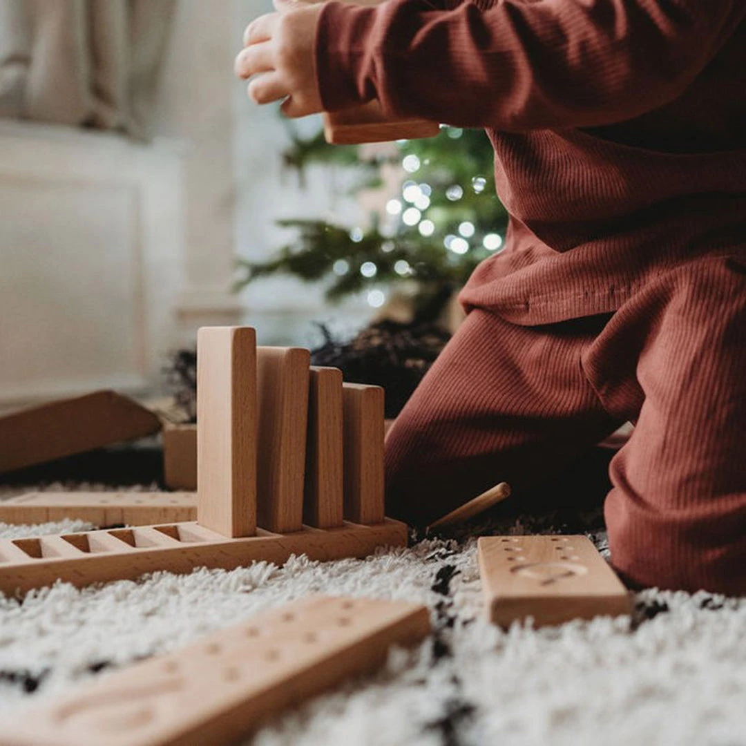The board and stand are made from solid beech wood sourced from local wood suppliers in Italy and Germany. They are finished with a natural raw oil. The blocks come with a tracing stick which is designed to help develop pencil grip.