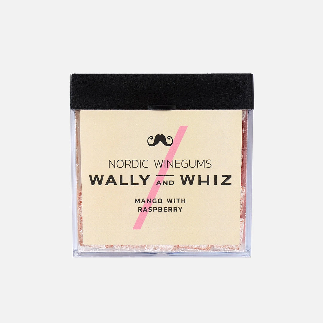 Delicious Nordic Winegums Mango with raspberry – sold as a cube of 140g.