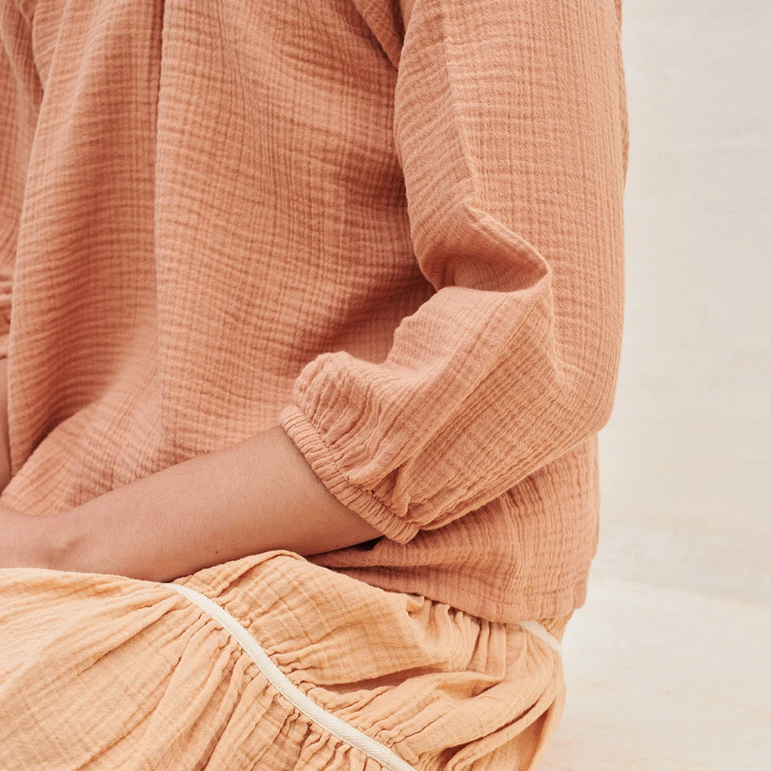 Designed with an elasticated neckline which can be worn up or styled as off shoulder. Features elasticated cuffs and waist for a comfortable fit. Easy to style with almost anything and great styled as a summer layer under dungarees or a dress. Woven in Liilu’s lightweight soft organic cotton muslin.